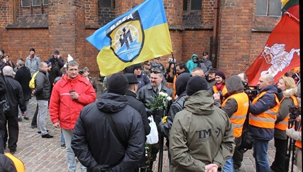 В шествии участников латышского легиона Ваффен СС и их сторонников, которое прошло в центре Риги в среду, приняли участие и представители украинского националистического добровольческого батальона "Азов".