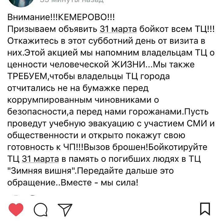 Друзья, Товарищи и просто проходящие мимо моей анкеты! Сегодня увидел такую запись в инстаграмме. Призываю продолжить эту "акцию" и у нас в Эстонии и так же во всём евросоюзе! Если Вы скажите, что это произошло в России и Нас это не коснётся, то Вы глубоко заблуждаетесь! У Нас В ЕС происходит не меньшая коррупция! Вспомните последние проверки в ТЦ, когда они были? Я не помню ни одной в своей жизни! Как у нас строятся эти коробки супермаркетов? По каким стандартам? Кто их проверяет и за какие откаты? Пусть и у нас проверят все ТЦ, проведут учебные тревоги! У нас стоят такие охранники, которые не только не смогут помочь в эвукуации людей, но и сами не смогут выползти в случае ЧС!!! А ещё, если вы считаете, что в ЕС такого не может произойти, то давайте вспомним трагедию в Рижской MAXIMA!!!! Призываю присоединиться к бойкоту в России и не посещать ТЦ 31 марта также в Эстонии и во всём ЕС! Кто поддерживает ставим класс!!!