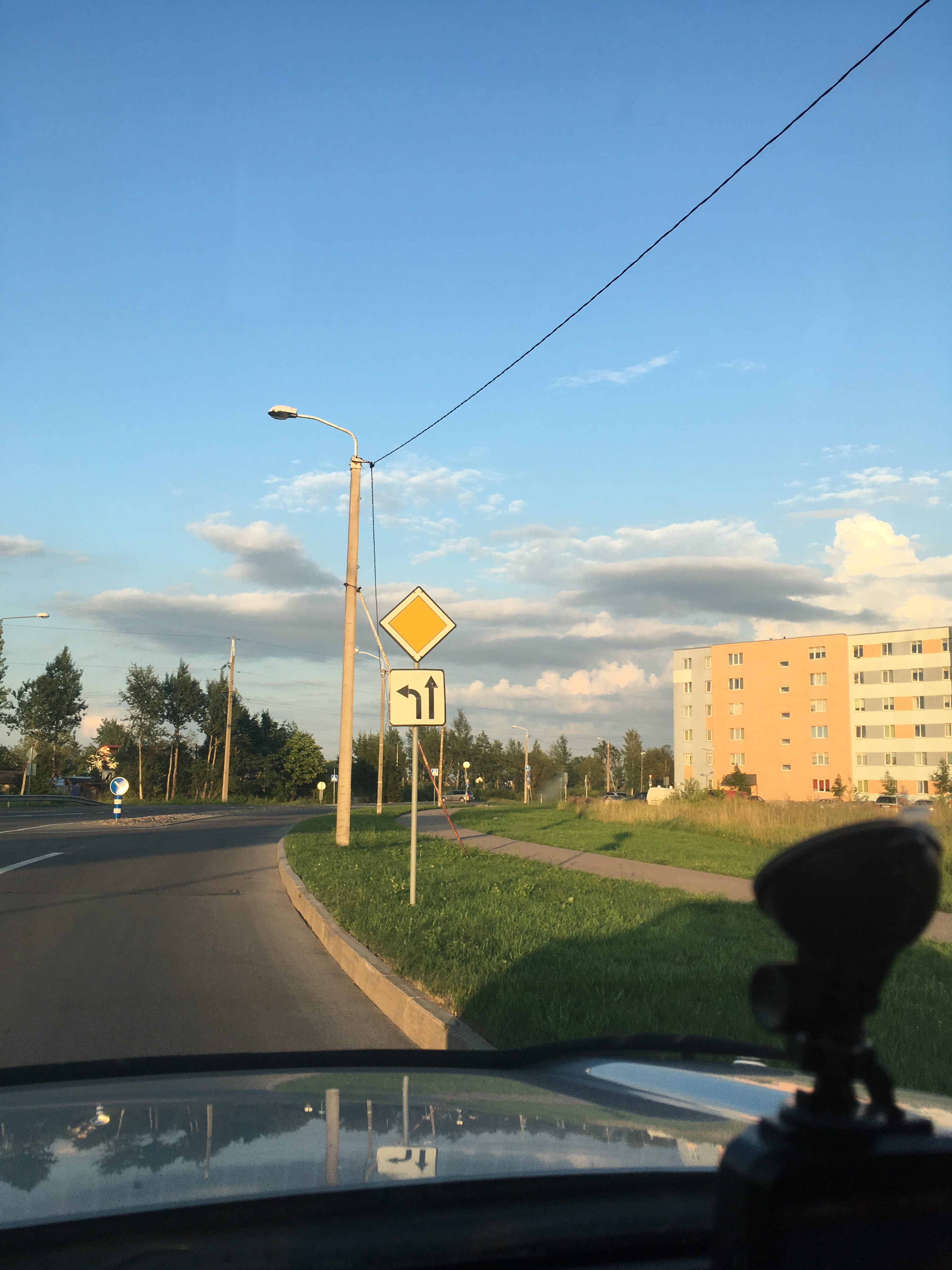 Вот такие знаки стоят на новой объездной дороге, которая ведет на Усть-Нарву, мимо очистных. Каждый день езжу с работы по ул. Пушкина, от первой школы до ул. Раху. Съезжаю с главной направо, на новую дорогу. Стоит знак – главная дорога прямо и поворот направо. И точно такой же знак стоит на встречном направлении от Эспака - главная дорога прямо на ул. Пушкина и поворот налево.