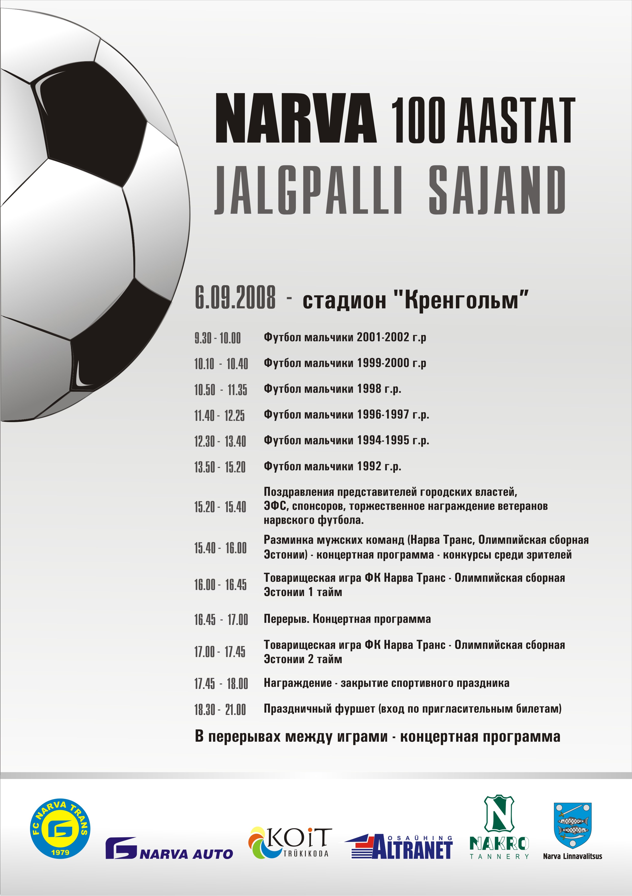 6-го сентября, на стадионе "Кренгольм", под эгидой ФК "Нарва-Транс" и при поддержке городских властей, пройдёт спортивный праздник, посвящённый 100-летию нарвского футбола.