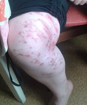 Это похоже на ожог травы какой-то или возможно водоросли, у самого такое было на речке!