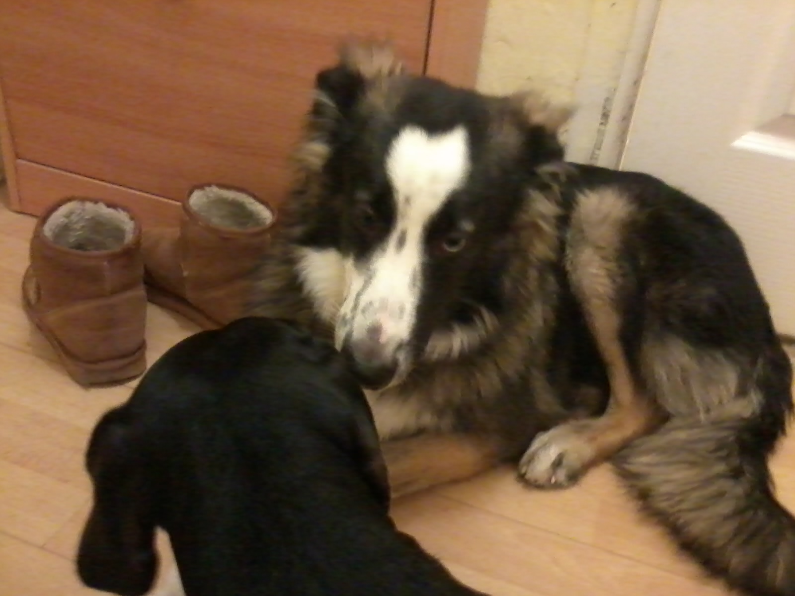 Около хоровой школы найдена собака (кобель) с разным цветом глаз. Собака бегала по улице высматривая хозяев, чуть не попала под проезжающие мимо машины. Не смогли оставить на улице в такой мороз, а дома кот, и он в шоке от такого "гостя".
