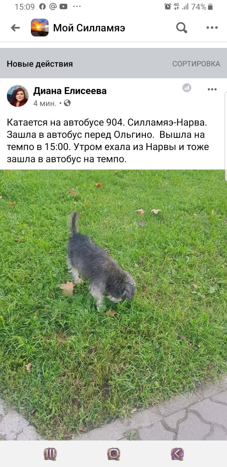 Катается на автобусе 904 Силламяэ-Нарва. Собачка зашла в автобус перед Ольгино, вышла на Темпо в 15:00. Утром ехала из Нарвы и тоже зашла в автобус на Темпо.