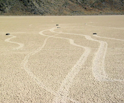 А вот с "гоночной трассой" все намного сложнее. Глинистое дно Рейстрэк-Плайя почти всё время сухое, и ничего на нём не растёт. Оно покрыто почти равномерным узором из трещин, образующих неправильные шестиугольные ячейки. Но там есть ещё кое-что, намного более интересное. На дне валяются камни — увесистые глыбы массой до тридцати килограммов. Но на самом деле они там не лежат неподвижно: временами они сами движутся, оставляя за собой на земле неглубокие (не больше пары сантиметров), но очень длинные (до нескольких десятков метров) борозды.