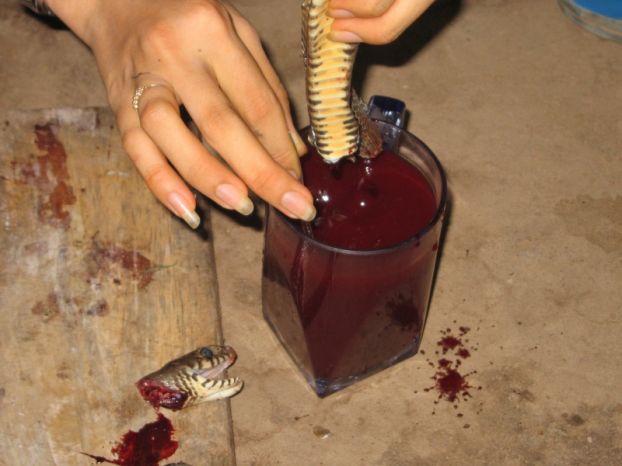 Далее кровь смешивается с вьетнамским самогоном и употребляется вприкуску с практически еще живым сердцем змеи .