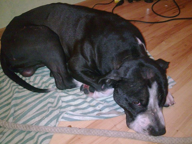 Найдена собака породы стафф или питбуль в районе Кангеласте 9, окрас черный с белыми пятнами, кабель. Спокойная, добрая предполагаем, что домашняя, молодой.