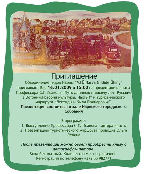 В ходе презентации маршрута выступит Профессор Тартуского Государственного университета С. Исаков, который расскажет о своей новой книге «Путь длиною в тысячу лет. Русские в Эстонии. История культуры. Часть I», в которой подробно описана история Принаровского края и людей живших и бывавших тут. После презентации можно будет приобрести книгу и получить автограф ее автора.