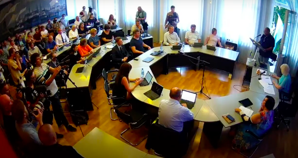 Фото: Алексей Иванов/"Нарвская газета" В четверг, 23 апреля, на очередном заседании Нарвского городского собрания Центристская партия и новая фракция "План Б Нарва", находящиеся сейчас в оппозиции, передали заявление о вотуме недоверия председателю горсобрания Михаилу Стальнухину, его заместителю Яне Кондрашовой и мэру Катри Райк, пишет Rus.Err.